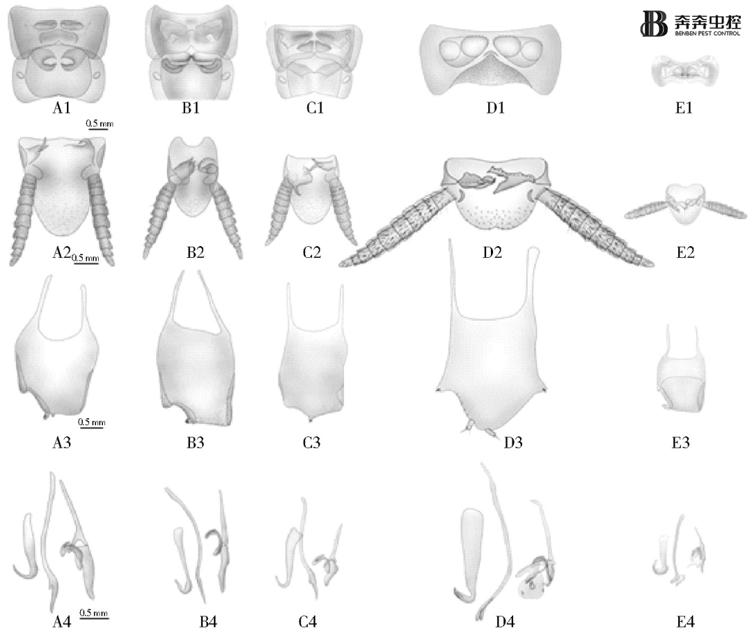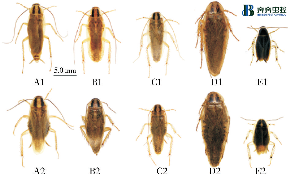 A. 德國小蠊;B. 擬德國小蠊;C. 雙紋小蠊;D. 毛背小蠊;E. 單尾小蠊。