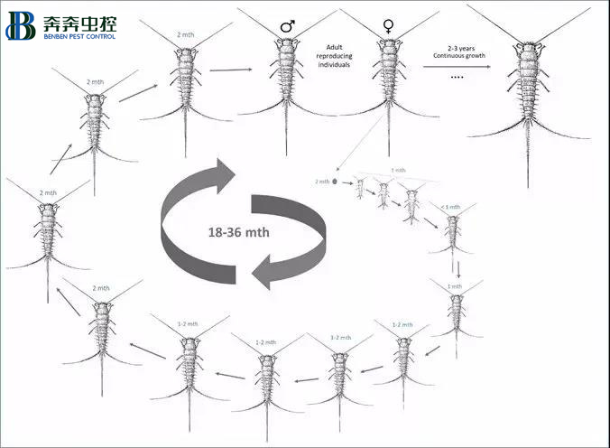 2.衣魚從幼蟲到成蟲約需4~6個(gè)月,衣魚的發(fā)育為半變態(tài),幼蟲到成蟲要蛻皮8次,成蟲期也仍會(huì)脫皮,壽命可長達(dá)2~8年。