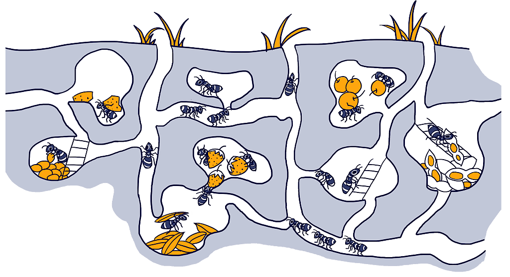 此外螞蟻還可能會和灰蝶幼蟲等動物在一個洞穴里過冬,這些動物可以分泌蜜露,這樣螞蟻就可以在冬天也可以吃到一些營養甜食。